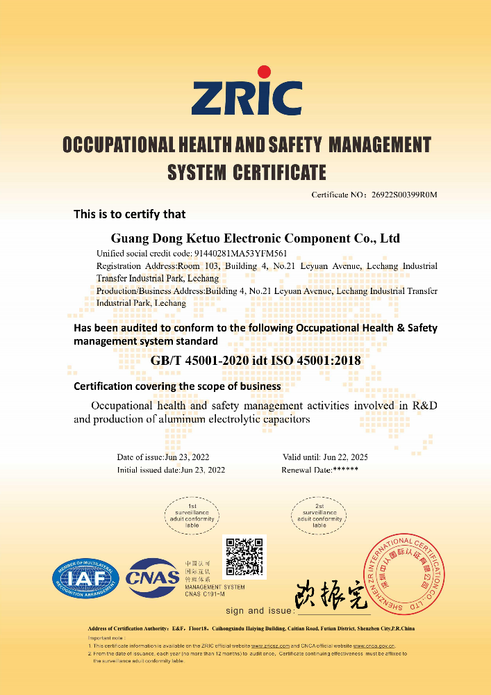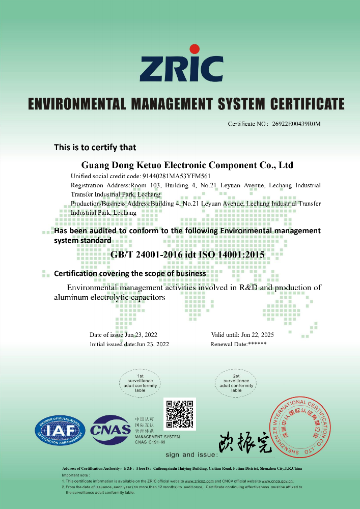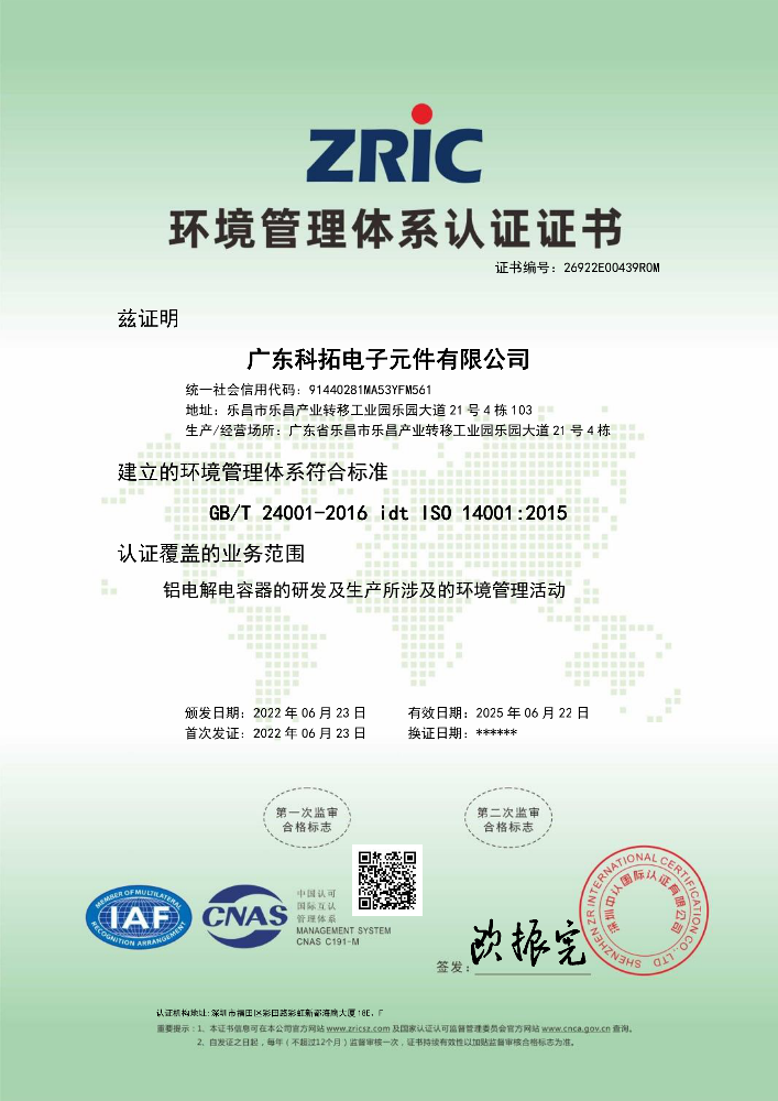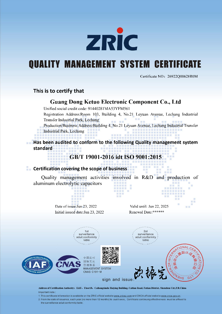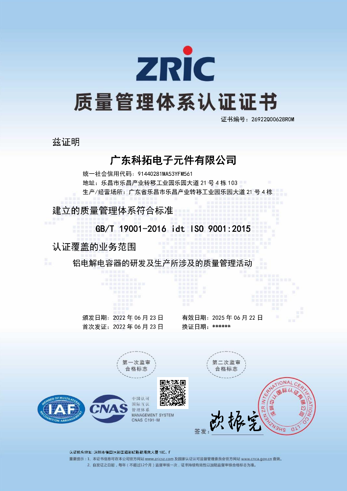 廣東科拓電子元件有限公司成立于2019年,位于韶關樂昌市樂昌產業轉移園區4棟,注冊資本2800萬元。現有廠房10000平米,員工300多人,鋁電解電容年產能達到40億只/年。公司前身深圳市科拓電子元件有限公司創建于1997年,生產鋁質電解電容器,經過二十年研發和開展自動化生產并持續不斷擴增經營規模,于2019年開設韶關生產基地。一直致力于高品質鋁電解電容器的開發和生產,同時采用領先生產工藝以及國內外先進的全自動化設備生產。本公司對于原材料之成份檢驗,以及整體制程工序方面,設置相關設備器材以支援質量控管,確保符合[rohs]指令要求,貫行綠色生產機制,贏得客戶信賴。本公司于電容器行業績逾25年經驗,其電容器產品享譽盛名,且建立強大客戶基礎。目前本公司鋁質電解電容器制造技術已相當成熟,產品尺寸規格齊全、具有長壽命、高電容、低阻、并且具備耐高溫、高壓的工作特性,多項主力產品均符合這些特點。科拓公司的使命是要為客戶提供一應俱全的電容器,以滿足世界各地的客戶的不同需求,為達到這個目標,科拓在各方面不斷努力,包括在研究及發展工作和生產設備上,不斷以做得更好并與客戶聯合發展產品,以及時在不同市場上推出新產品來滿足客戶的要求。公司通過了1S09001∶2008質量體系認證和lSO
